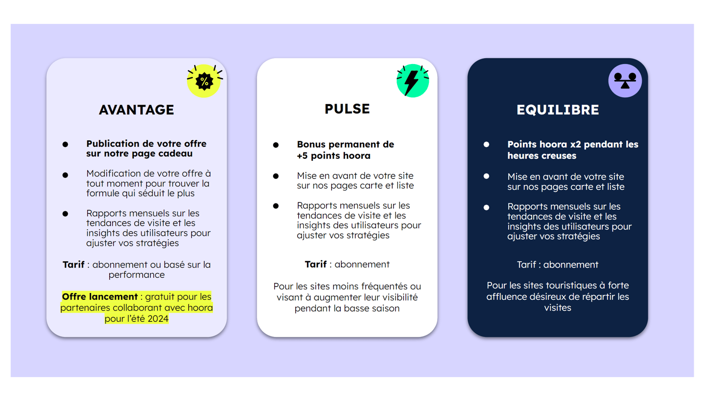 Selon votre site touristique, selon la période de l'année, vos besoins peuvent varier. Nos offres vous permettent de gagner en visibilité sur notre application afin de vous démarquer pendant les périodes de moindre affluence.